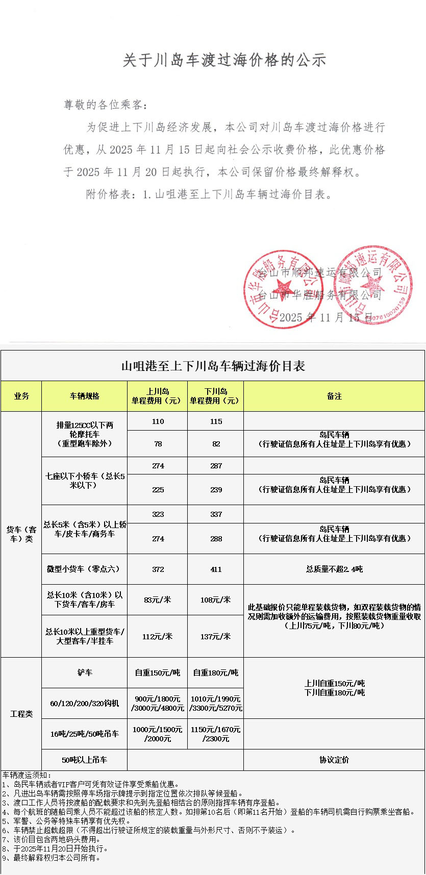 为促进上下川岛经济发展,本公司对川岛车渡过海价格进行优惠,从2025年11月15…